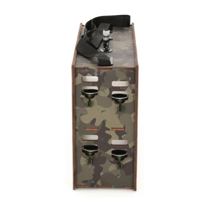Cassetta per il trasporto dei piccioni Pianeta Colombaccio. Casetta realizzata in legno naturale e finitura camouflage con tracolla e maniglia per il trasporto. Fondo amovibile per la pulizia e due bicchierini mangiare e bere, per ogni scomparto. Dimensioni: 28x38x16 cm