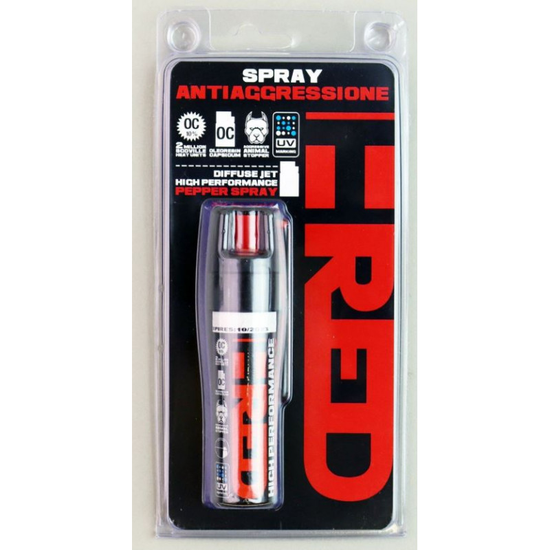 Spray al peperoncino per autodifesa. Spray antiaggressione al peperoncino a base naturale estratto dell'oleoresin capsicum (olio ricavato dalla distillazione del peperoncino rosso). Leggero, dalle dimensioni tascabili, con un'impugnatura estremamente ergonomica e dotato di sicura dorsale. Gittata massima 3 metri, 7 spruzzi da 1 secondo. Non contiene aggressivi chimici, sostanze infiammabili o sostanze corrosive, tossiche o cancerogene. Inoltre è munita di sistema di sicurezza contro l'attivazione accidentale.
