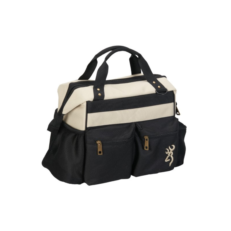 Borsa a mano e a spalla Browning mod.121041892 di colore nera e beige.Questa borsa portaoggetti è ideale da utilizzare durante le gare o allenamenti di tiro a volo. Realizzato in tessuto resistente, doppio manico per un facile e comodo trasporto. Vano principale molto capiente con chiusura zip con doppio cursore. Sono presenti 4 tasche secondarie con chiusura a zip. La borsa dispone di una tracolla regolabile e removibile secondo le vostre esigenze. Questo zaino è indicato come porta accessori per il tiro.