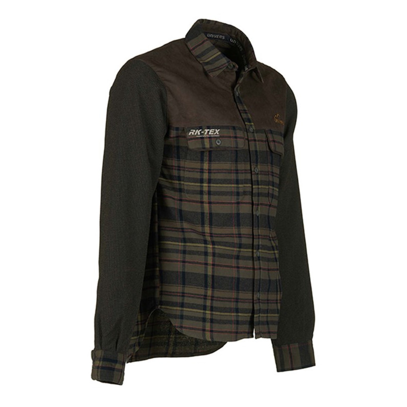 Camicia di flanella Univers mod. 94132 923. Camicia da caccia realizzata in calda e morbida flanella di cotone con spallacci in suede e maniche rinforzate con tessuto RK-TEX. La camicia è perfetta da utilizzare anche per il tempo libero e dispone di due tasche al petto con pattina.