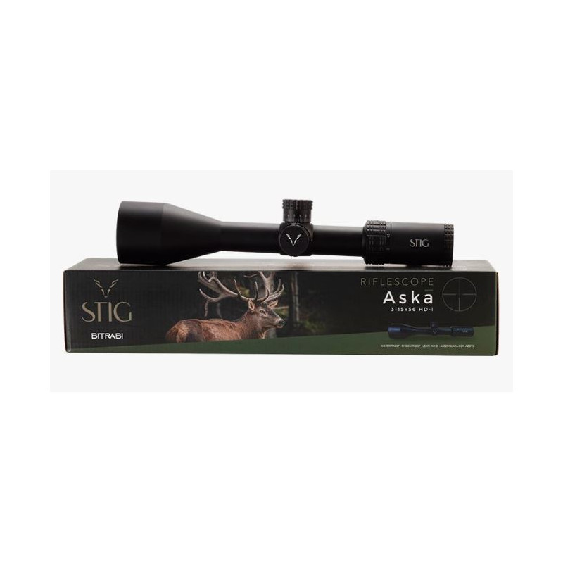 Cannocchiale Bitrabi modello STIG ASKA 3-15x56 HD-i. Ottica da selezione Bitrabi con reticolo illuminato. L'ottica dispone di un ampio range di ingrandimenti da 3 a 15; campana e relativa lente di ben 56 mm per catturare, sfruttare e trasmettere al meglio anche la minima presenza di luce; lenti multistrato HD e l’assemblaggio caricato ad azoto. Ideale sia per i tiri con luce crepuscolare che per tiri a lunghissime distanze. STIG ASKA 3-15×56 HD-i ha la possibilità di illuminare il reticolo di color rosso su 6 livelli di potenza. L'oculare grandangolo fornisce un ampio campo visivo con immagini di altissima qualità e definizione grazie alle lenti multistrato HD, il tutto assemblato in azoto. Realizzata in alluminio aereonautico con finitura nera opaca antigraffio, mentre i meccanismi interni sono realizzati completamente in metallo; il sistema di regolazione della taratura dell’ottica è realizzato con componenti ricavati dal pieno. L'ottica per carabina da caccia STIG ASKA 3-15×56 HD-i è dotata di due torrette balistiche con un pratico, affidabile e molto preciso sistema di lock down sia per le regolazioni alto/basso che destra/sinistra.