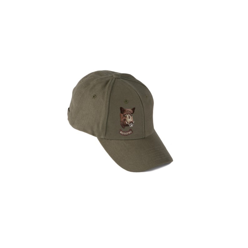 Cappello Riserva mod. R9028CIN nel colore verde con ricamato il cinghiale. Ideale per la caccia e per il tempo libero. Questo cappello è realizzato in cotone 100% e posteriormente ha il cinturino per la regolazione della circonferenza del capo con chiusura a clip. Cappello da caccia con ricamo del cinghiale nella parte anteriore e del logo Riserva.
