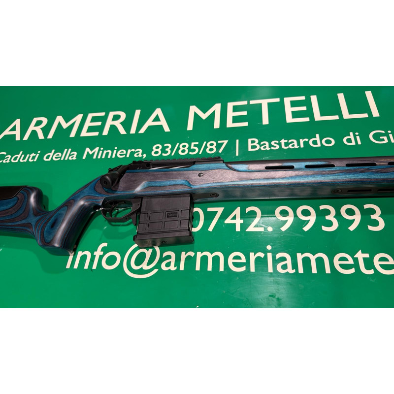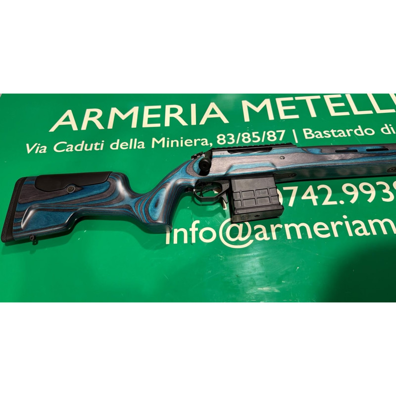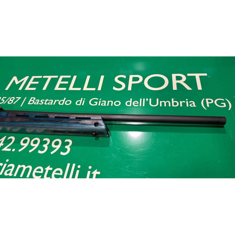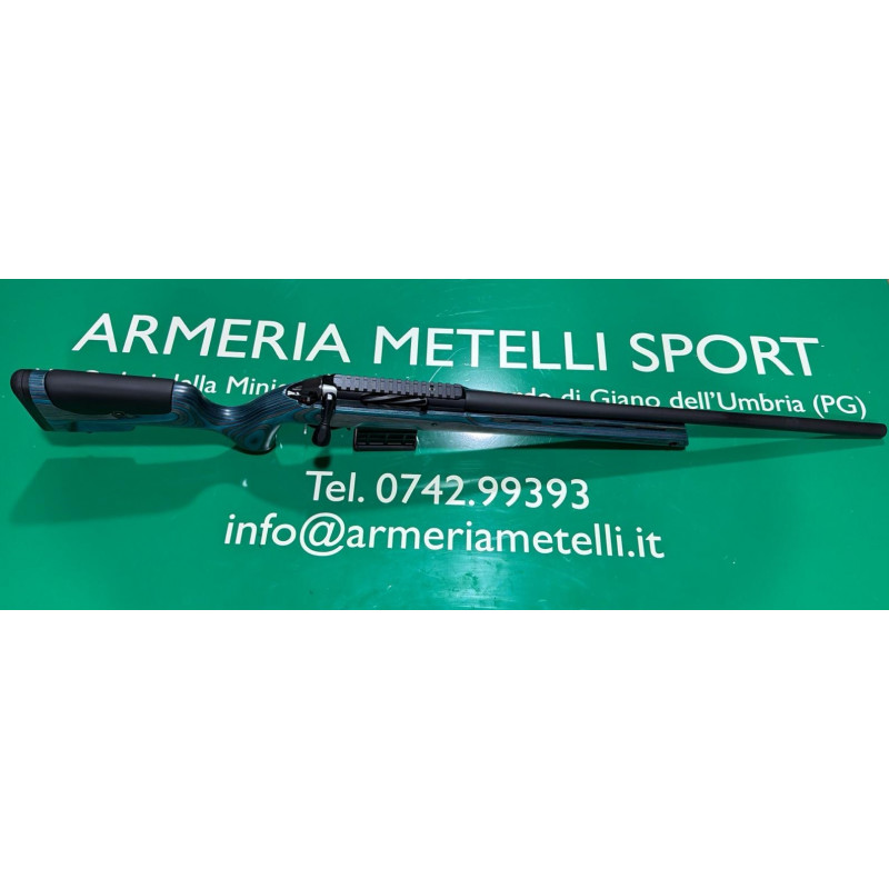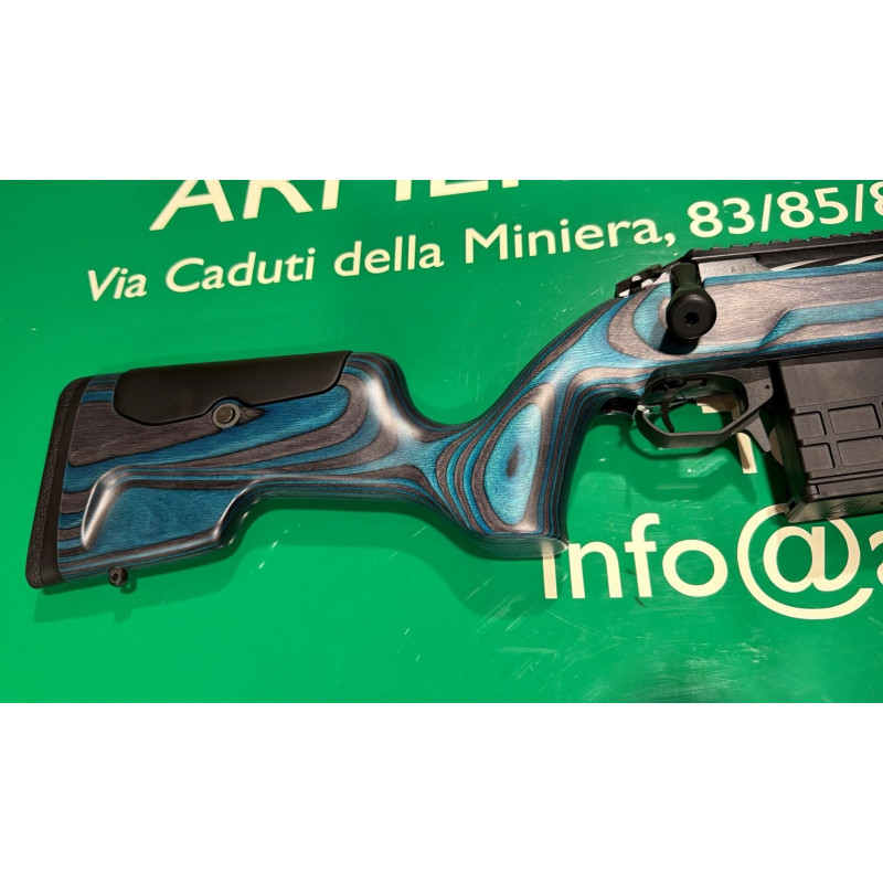 Carabina bolt action con otturatore Sabatti modello Rover Varmint calibro 308 Winchester in legno laminato blu e nero.