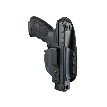 Fondina porta pistola interna Beretta destra, realizzata in vera pelle di colore nero. Fondina interna pratica, multifunzionale e molto resistente. Aderisce perfettamente al corpo grazie al profilo posteriore piatto. Dispone del dispositivo di sicurezza antiurto, una leva di rilascio che è sensibilizzata, rigida e resistente all'usura che apre la fondina in modo naturale e sicuro.