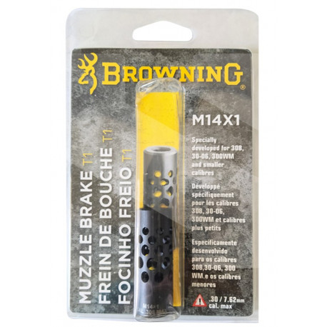 Freno di bocca T1 M14X1 Browning di colore nero. Il freno di bocca browning riduce il rinculo fino al 30%. E' appositamente sviluppato per i calibri 308 , 30-06 , 300WM e per calibri piu' piccoli.