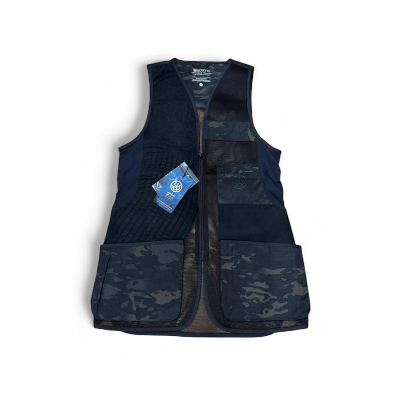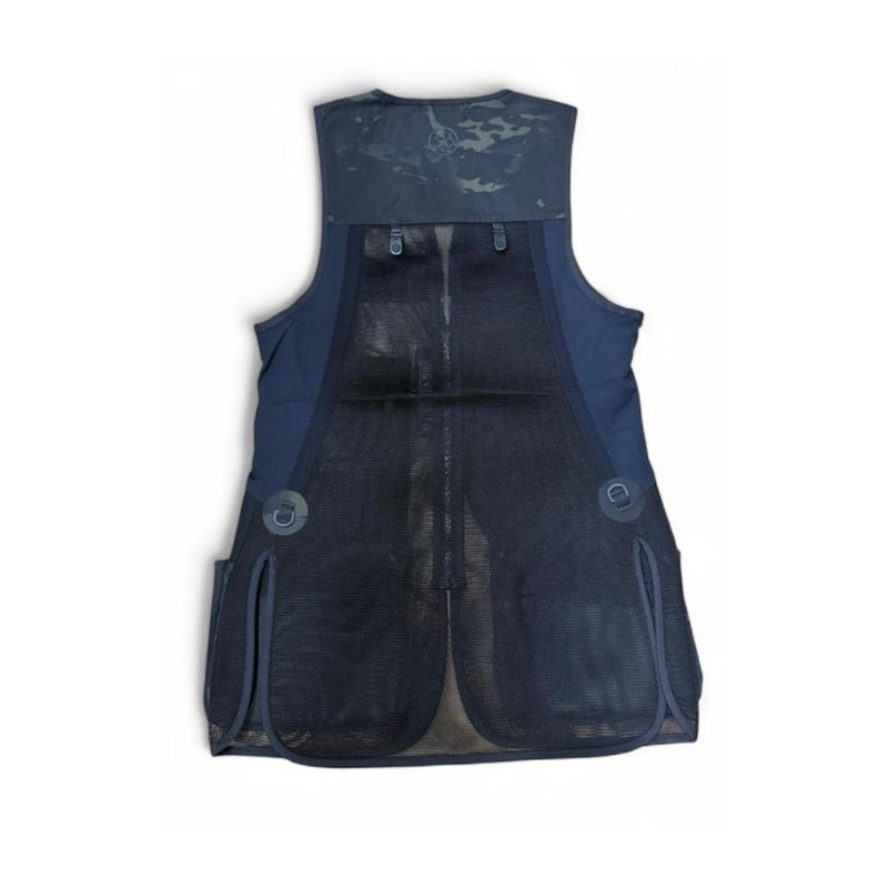 Gilet da tiro Beretta blu mod. GT621 02113 058R, fedele replica del Gilet Olimpico, usato dai campioni Italiani ai Giochi Olimpici del 2016 e nei campionati del Mondo ISSF, con rete traspirante, strisce tricolore della nazionale italiana, dotato di tasche frontali con stemma e strisce tricolore, scivolo anteriore in alcantara.