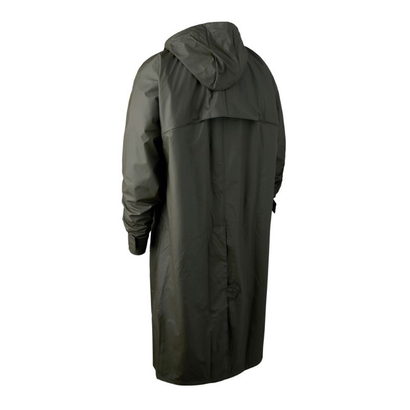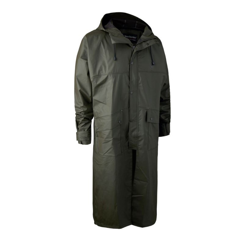 Impermeabile lungo modello Hurricane art. 5173 376 DEERHUNTER. Impermeabile con cappuccio e spacco sul retro. Impermeabile con cappuccio in tinta unita verde realizzato con rivestimento in PU. Tasche anteriori con bottoni e ventilazione sul retro e sotto il braccio. Lavabile in lavatrice. Ideale per la caccia e per il tempo libero.