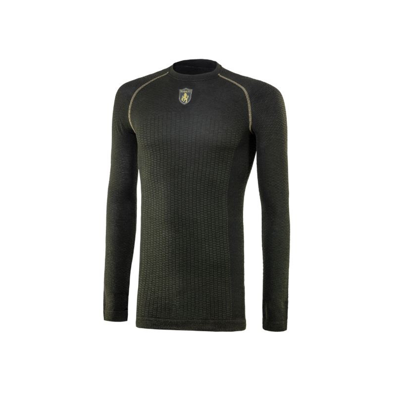 Maglia tecnica Trabaldo a manica lunga, modello Maglia M/L di colore verde art. MAGLIA M/L 450/WOOL/DRYARN. Maglia intima a maniche lunghe per le attività prolungate ad alta intensità in climi freddi, quando massimizzare traspirazione e asciugatura è fondamentale per il nostro rendimento. Maglia tecnica realizzata in unione tra il polipropilene DRYARN® e la lana merino con tecnologia SEAMLESS, morbida a contatto con la pelle, dispone di elevate proprietà di traspirazione e rapidità di asciugatura. L'impiego della lana merino aumenta le proprietà coibenti e, grazie alle sue naturali proprietà batteriostatiche, riduce l'insorgenza di cattivi odori dovuti all'utilizzo intenso e prolungato. Adatto alla caccia in movimento in inverno con temperature rigide ma anche per il tempo libero.