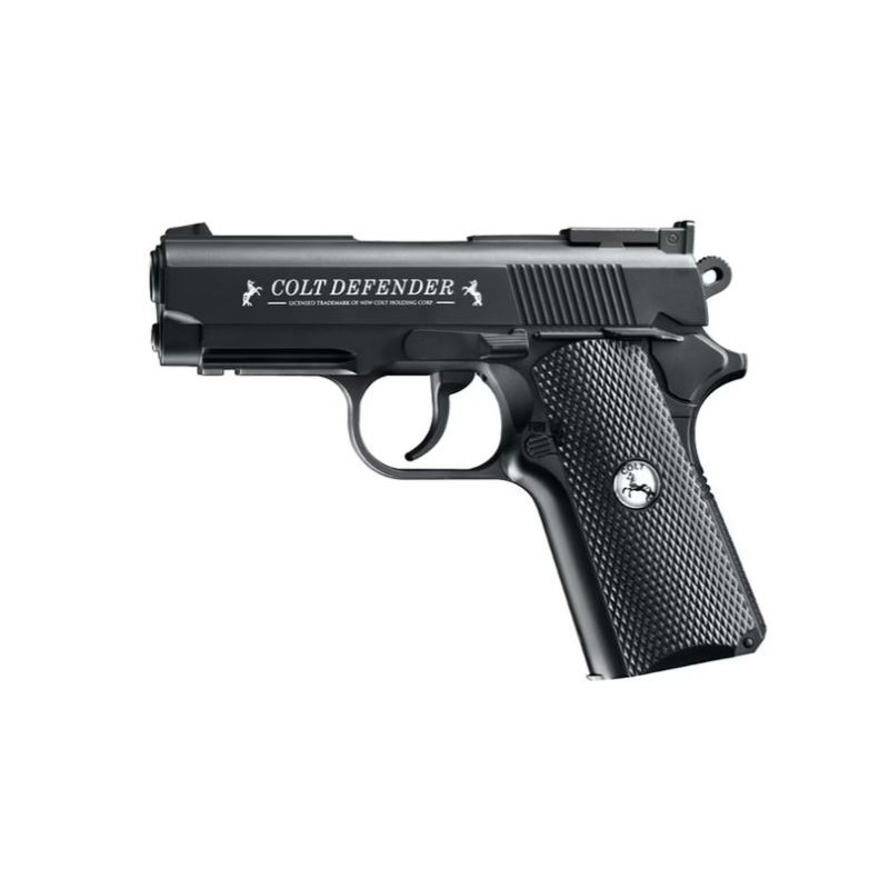 Pistola Umarex Co2 COLT DEFENDER cal. 4.5 mm di libera vendita. Pistola CO2 libera vendita pesante versione realizzata interamente in metallo come il leggendario classico Colt Defender. Sull'impugnatura è presente una canna in polimero nero con superficie ruvida. Il meccanismo interno è alimentato da una cartuccia di CO2 da 12 g che viene inserita in una camera nell'impugnatura. Il caricatore è progettato per contenere 16 pallini BB in acciaio. La pistola è adatta al tiro ricreativo e distruttivo grazie alla sua canna liscia. La pistola è protetta da una sicura manuale situata sul lato destro sopra il grilletto. La guida inferiore Weaver offre un posto per collegare una torcia tattica o altri accessori tattici.