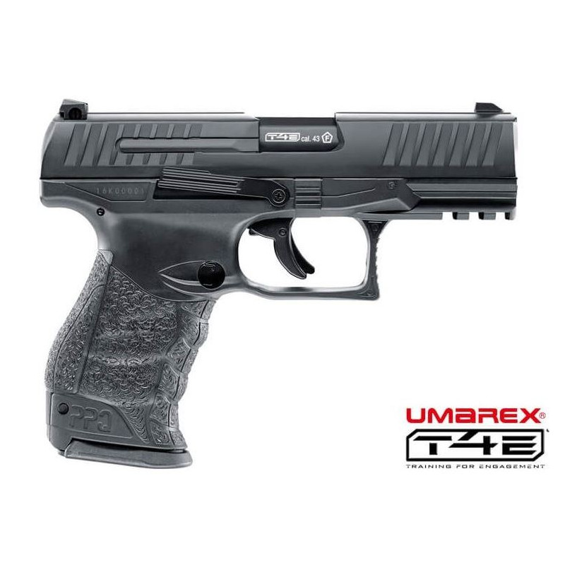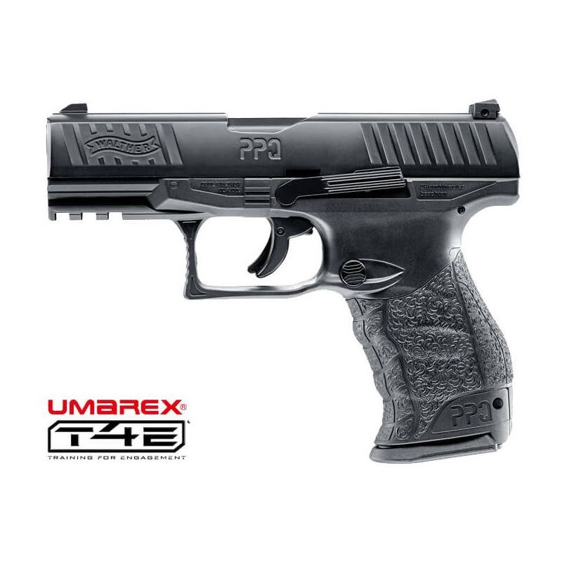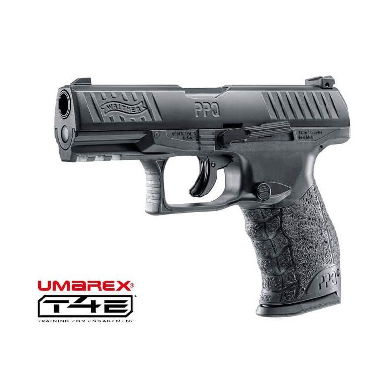 Pistola Walther Co2 T4E PPQ M2 calibro .43 scarrellante di libera vendita con pallini di gomma per difesa abitativa. La Walther PPQ M2 è una pistola di grande successo a livello internazionale ed è ora disponibile in una versione da allenamento e difesa in calibro .43. Questa pistola a CO2 offre maneggio e caricamento realistici.T4E è l'abbreviazione Umarex di ''Training for Engagement'' ovvero allenamento all' ingaggio. Gli otto colpi del caricatore escono con un'energia entro 4 a 5 joule.