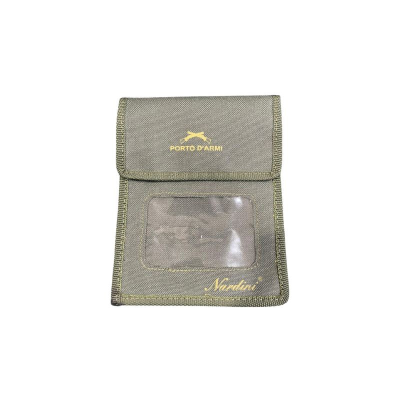 Porta licenza caccia Nardini verde piatto e compatto. Porta documenti da caccia realizzato in cordura di colore verde con velcro, sul retro dispone di un ulteriore tasca con chiusura con bottone automatico.