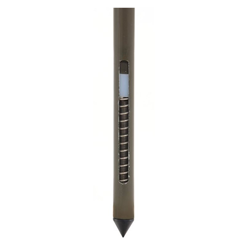 Racchetta per colombacci art. 102/2 PIANETA COLOMBACCIO. Racchetta con diametro 25 mm e altezza 120 cm. Realizzata in alluminio, verniciatura a polvere 200°, piattino in rete, legata a mano, molla inox con ammortizzatore e filo scorrevole internamente. Particolare del puntale: è forato per permettere la fuoriscita dell’acqua in caso di pioggia.