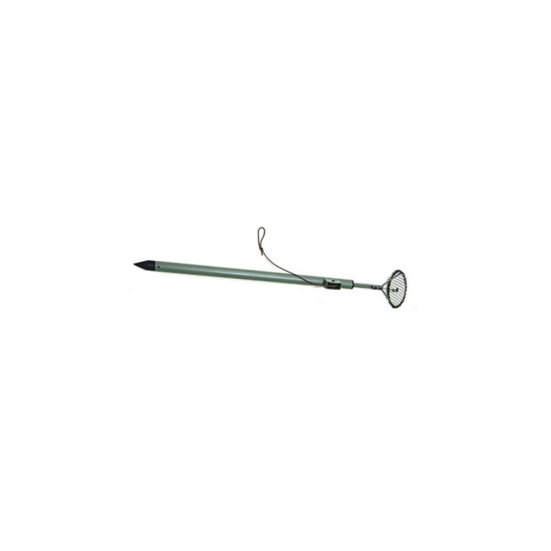 Racchetta a ribalta per colombaccio. Questa ribaltina è realizzata in alluminio verniciato color verde ed ha una racchetta con retina per il colombo vivo da richiamo. Alla base è presente il punteruolo che ne permette l'utilizza piantandolo nel terreno.